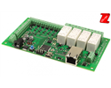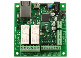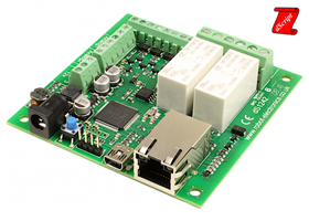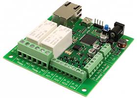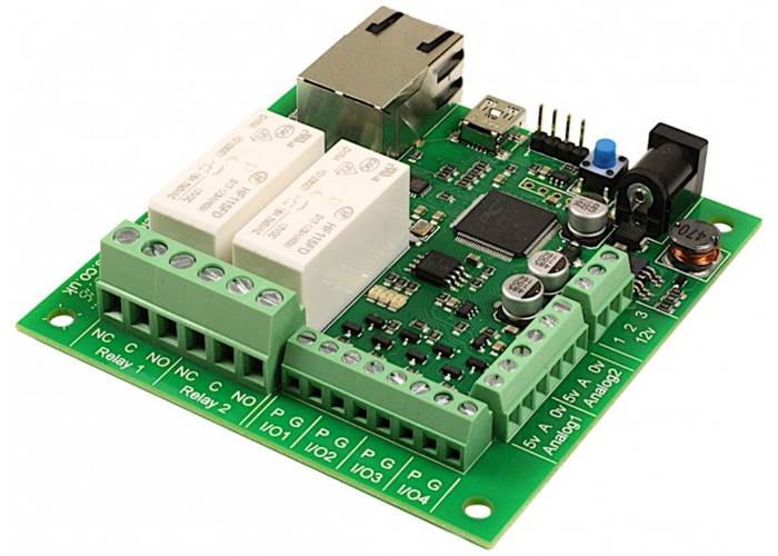Control two 16 Amp relays and read over an ethernet connection using a web page or via simple TCP/IP based commands. This feature packed board also has 4 digital I/O, 2 analogue input connections plus a serial port. The module can be programmed to respond to inputs and send/receive commands over TCP/IP. You can even customise the web page interface.