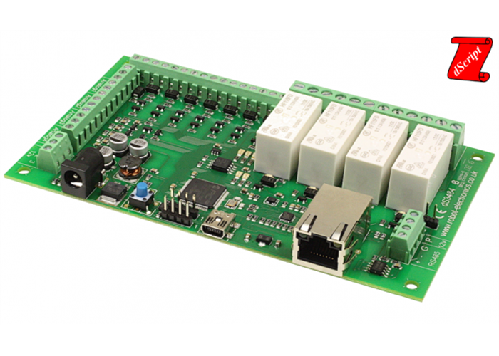 The ds3484 provides 4 relay outputs with a current rating of up to 16Amp each. It also has 8 digital I/O connections, 4 analogue, 3 serial ports and the module can be programmed using dScript (see below) enabling you to make the board respond to inputs and send/receive commands from other devices on the network.