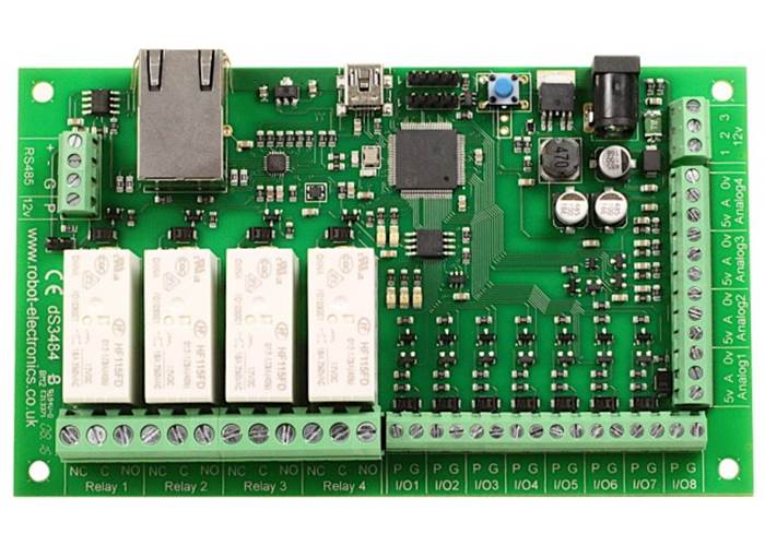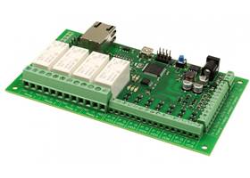 Control four 16 Amp relays and read over an ethernet connection using a web page or via simple TCP/IP based commands. This feature packed board also has 8 digital I/O, 4 analogue input connections plus 3 serial ports. The module can be programmed to respond to inputs and send/receive commands over TCP/IP. You can even customise the web page interface.