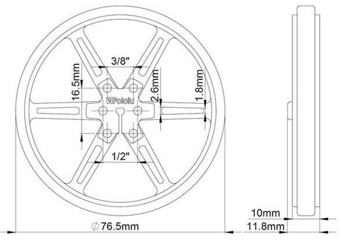 The wheels feature six mounting holes sized for #4 or M3 screws: one pair spaced 12.7 mm (0.5″) apart and two pairs spaced 19.1 mm (0.75″) apart. This spacing is compatible with our universal mounting hubs, which can serve as adapters between these wheels and the shafts on our larger metal gearmotors and stepper motors (see the table at the bottom of this page for information about which wheels are compatible with which universal mounting hubs). The pictures below show these wheels with a universal mounting hub for 6mm shafts installed so it can work with our 37D metal gearmotors.