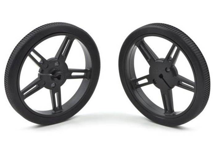 These black plastic wheels have silicone tires and measure 60 mm (2.36″) in diameter, and they press-fit onto 3mm D shafts, such as those on our micro metal gearmotors. Additionally, this wheel is compatible with several of our universal mounting hubs, which can serve as adapters for motors with different shafts. This product is a pair of wheels.