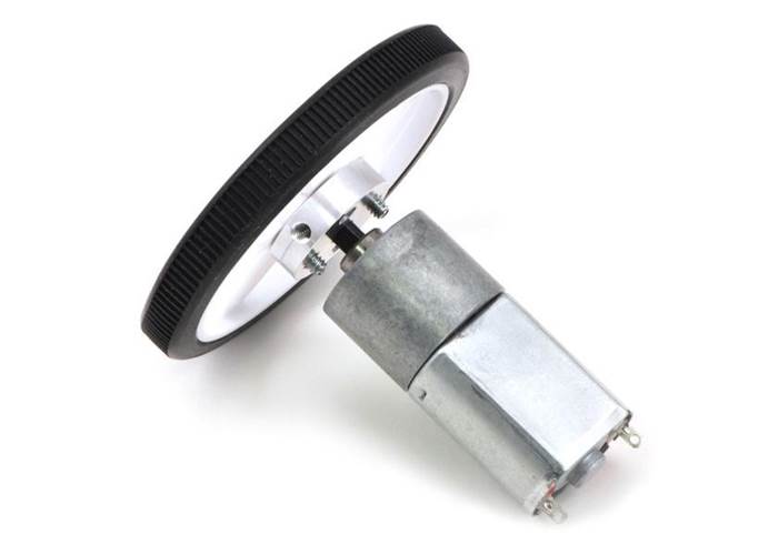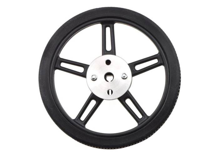 These black plastic wheels have silicone tires and measure 60 mm (2.36″) in diameter, and they press-fit onto 3mm D shafts, such as those on our micro metal gearmotors .