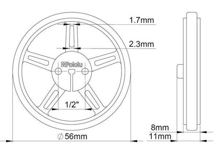The wheels feature two mounting holes sized for #4 or M3 screws and spaced 12.7 mm (0.5″) apart. This spacing is compatible with several of our universal mounting hubs, which can serve as adapters between these wheels and the shafts on our larger metal gearmotors and stepper motors (see the table at the bottom of this page for information about which wheels are compatible with which universal mounting hubs). The pictures below show these wheels with a universal mounting hub for 4mm shafts installed so it can work with our 20D or 25D metal gearmotors.