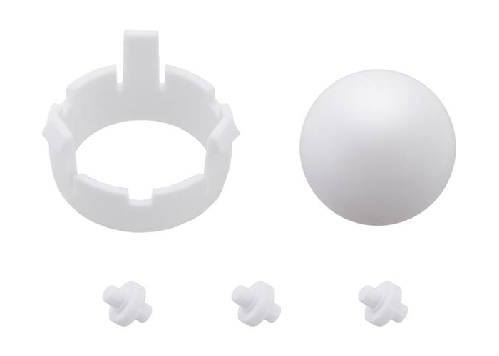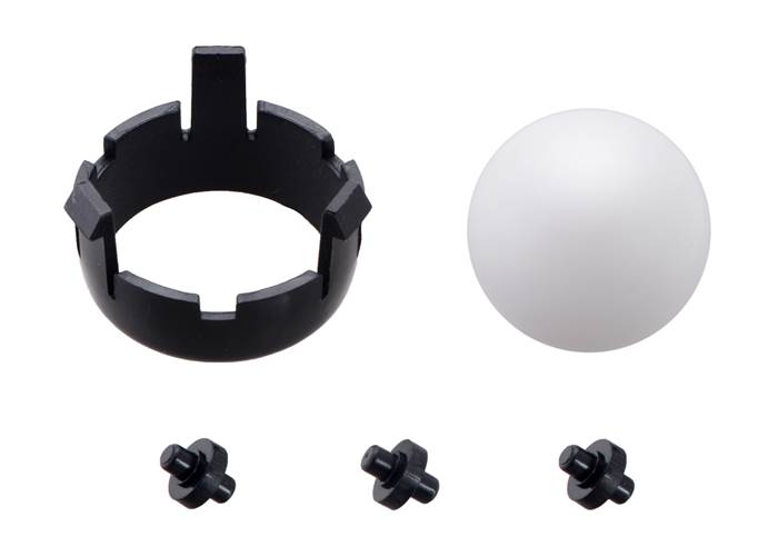This item is a set of three plastic rollers, a 1″-diameter plastic ball, and a retaining clip that can be used on the front or back ball castor locations on the Romi chassis base plate. The ball is white, and all other parts are blue . It is included as part of the blue Romi Chassis Kit .