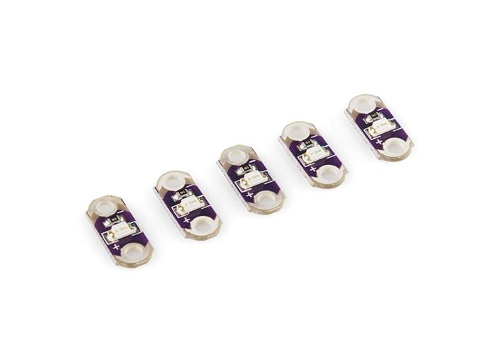 This is a simple pack of five Red LilyPad LEDs that are still attached to one another letting you snap the LEDs apart at your leisure to sew into clothing or whatever else you can dream up. LilyPad is a wearable e-textile technology developed by Dr.