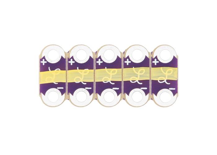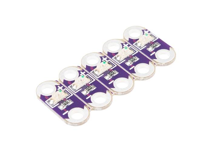 This is a simple pack of five Yellow LilyPad LEDs that are still attached to one another, letting you snap the LEDs apart at your leisure to sew into clothing or whatever else you can dream up.