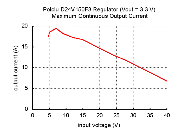 These regulators have an instantaneous current limit of approximately 32 A, but they are limited in the long term to much lower currents by power dissipation and the corresponding temperature rise that induces in the board. The regulators can typically support continuous output currents between 5 A and 20 A without additional cooling (such as with a heat sink or forced airflow), depending on the input voltage and output voltage. In general, the available output current is a little higher for the lower-voltage versions than it is for the higher-voltage versions, and it decreases as the input voltage increases. See the Typical efficiency and output current section at the bottom of this page for more details.
