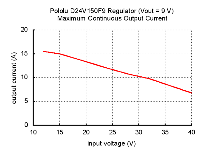 These regulators have an instantaneous current limit of approximately 32 A, but they are limited in the long term to much lower currents by power dissipation and the corresponding temperature rise that induces in the board. The regulators can typically support continuous output currents between 5 A and 20 A without additional cooling (such as with a heat sink or forced airflow), depending on the input voltage and output voltage. In general, the available output current is a little higher for the lower-voltage versions than it is for the higher-voltage versions, and it decreases as the input voltage increases. See the Typical efficiency and output current section at the bottom of this page for more details.