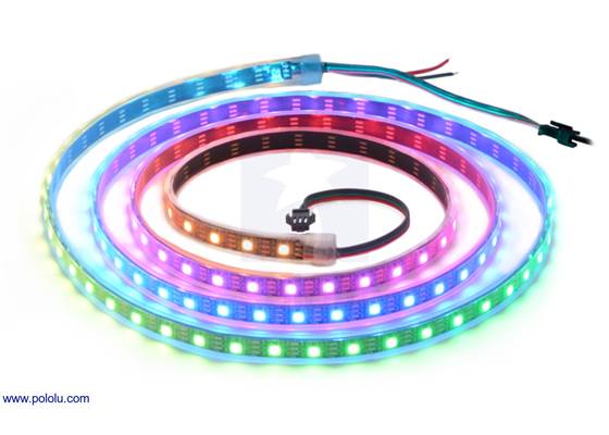 This 2-meter long strip contains 120 RGB LEDs that can be individually addressed using a one-wire interface, allowing you full control over the color of each RGB LED. The flexible, waterproof strip runs on 5 V and can be chained with additional SK6812 or WS2812B strips to form longer runs or cut apart between each LED for shorter sections.