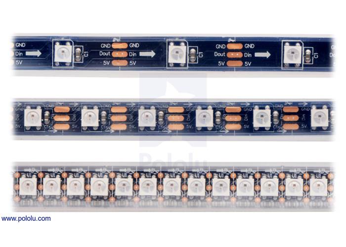 Each RGB LED receives data on its data input line and passes data on to the next LED using its data output line. The high-speed protocol of the SK6812 allows for fast updates; our library for the Arduino below takes about 1.1 ms to update 30 LEDs, so it is possible to update 450 LEDs faster than 60 Hz. However, constant updates are not necessary; the LED strip can hold its state indefinitely as long as power remains connected.