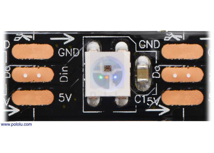 Like the SK6812, the APA102C used in some of our LED strips also combines an RGB LED and driver into a single 5050-size package. The APA102C uses a standard SPI interface with separate data and clock signals. With its loose timing requirements, the APA102C’s interface is easier to implement on new systems, especially systems that are running a full operating system like Windows or Linux. However, it requires two I/O lines instead of just one.