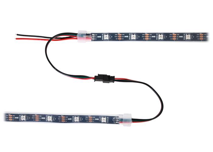 Each LED strip has three connection points: the input connector, the auxiliary power wires, and the output connector. These can be seen in the adjacent picture, from left to right: auxiliary power wires, input connector, output connector. The strip uses 3-pin JST SM connectors.