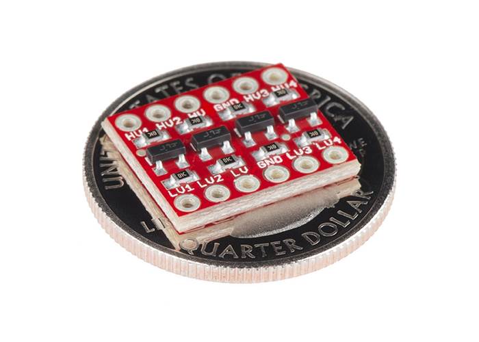 If you've ever tried to connect a 3.3V device to a 5V system, you know what a challenge it can be. The SparkFun bi-directional logic level converter is a small device that safely steps down 5V signals to 3.3V AND steps up 3.3V to 5V at the same time. This level converter also works with 2.8V and 1.8V devices. What really separates this Logic level converter from our previous versions is that you can successfully set your high and low voltages and step up and down between them safely on the same channel. Each level converter has the capability of converting 4 pins on the high side to 4 pins on the low side with two inputs and two outputs provided for each side.