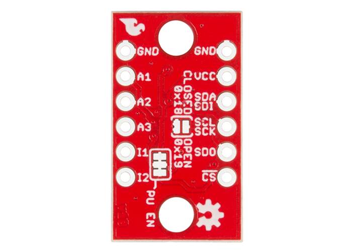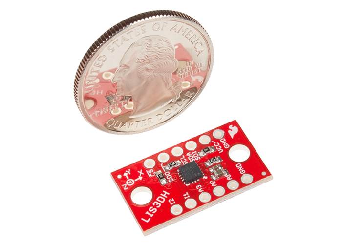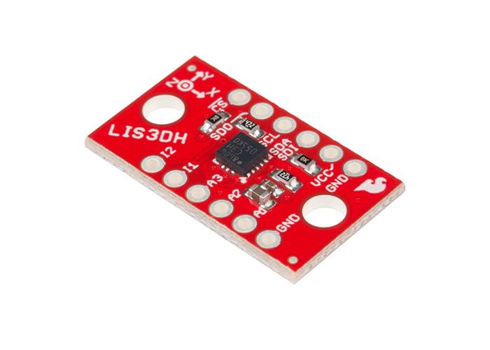 The LIS3DH is easy to set up; just wire up your choice of interface (SPI or I2C), supply 3.3V, and ground. This sensor works nicely with a breadboard for easy connection, and, because it gives some mass to the accelerometer, it more closely matches what might be expected from a project or cellphone.