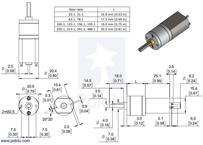 The diagram below shows the dimensions of the 20D mm line of metal gearmotors (units are mm over [inches]). This diagram is also available as a downloadable PDF (99k pdf).