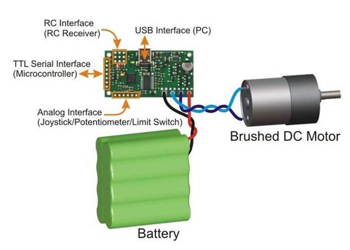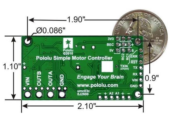 The Pololu Simple Motor Controller makes basic control of brushed DC motors easy, with our free Simple Motor Control Centre software enabling quick configuration over USB. The controller supports four interface modes: USB, TTL serial, analogue voltage, and hobby radio control (RC).