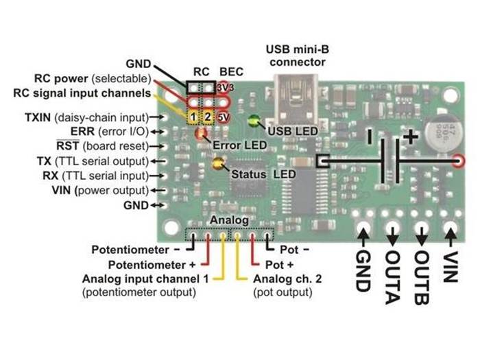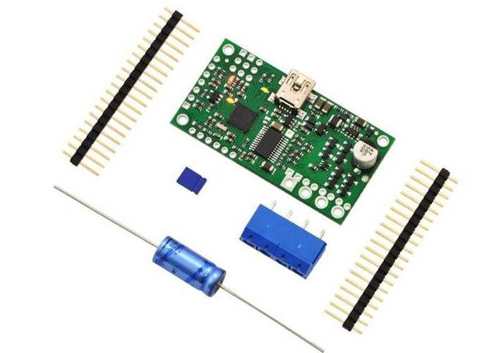 Note: The power capacitor has a significant effect on performance; the included capacitor is the minimum size recommended, and bigger ones can be added if there is space. A bigger capacitor might be required if the power supply is poor or far (more than about a foot) from the controller.