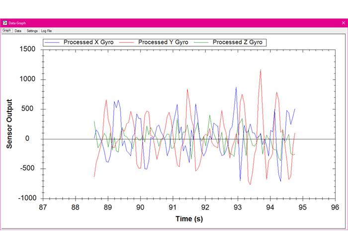 Graph of gyro readings displayed by the Redshift Serial Interface connected to a UM7 orientation sensor.