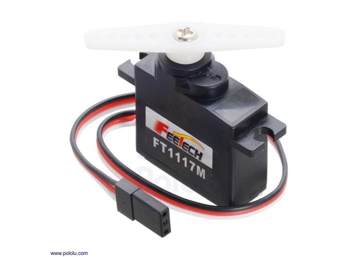The FT1117 from FEETECH is a miniature-sized servo with the same output spline as standard servos, making it compatible with standard-sized servo horns, and the gear train is made primarily of metal gears. Servo horns and associated hardware are included. This servo can work with both 5 V and 3.3 V servo signals.