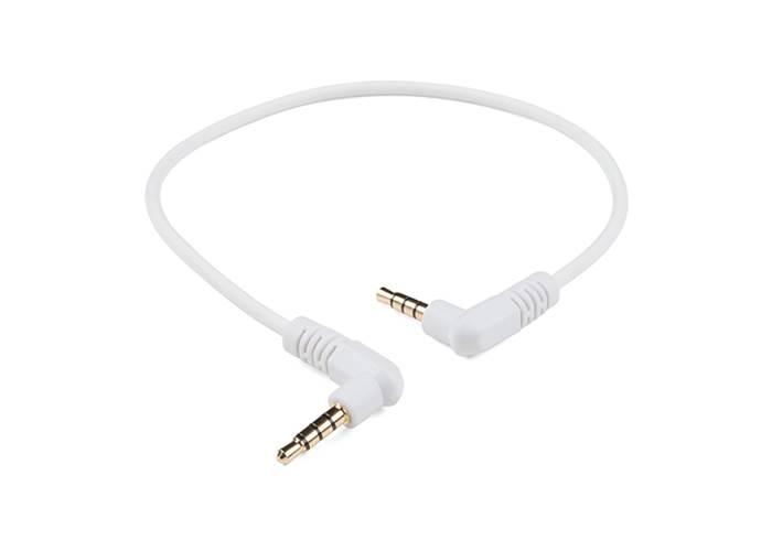 This is a foot-long white audio cable that has been terminated with two TRRS connectors at each end. TRRS connectors are the 3.5mm audio-style connectors that you see on some phones MP3 players and development boards.