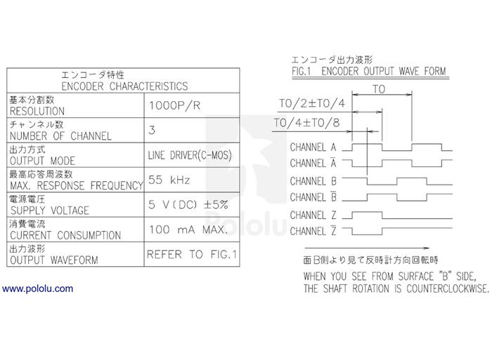 The integrated quadrature encoder operates from 5 V and has a resolution of 1000 P/R, which allows for 4000 counts per revolution (CPR) of the output shaft when counting both edges (i.e. rising and falling) of both channels (i.e. A and B). In addition to the A and B channel outputs, the encoder has a home channel, Z, that pulses once per revolution and can be used for absolute positioning. The encoder also has outputs for the inverse of A, B, and Z. A 15 cm (6″) encoder cable is included.