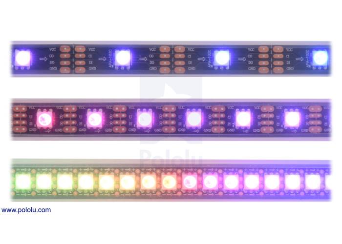 This LED strip has a length of 2 m and contains 60 RGB LEDs that can be individually addressed using an easy-to-control SPI interface, allowing you full control over the colour of each RGB LED.