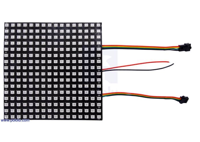 The LEDs in the panel are connected in a “serpentine” or “boustrophedon” layout, meaning that the direction of the data signals in each row alternates. The signals in each row go in the direction that is the opposite of the row before it. The top side of the LED panel has white arrows to indicate which direction the signals propagate.