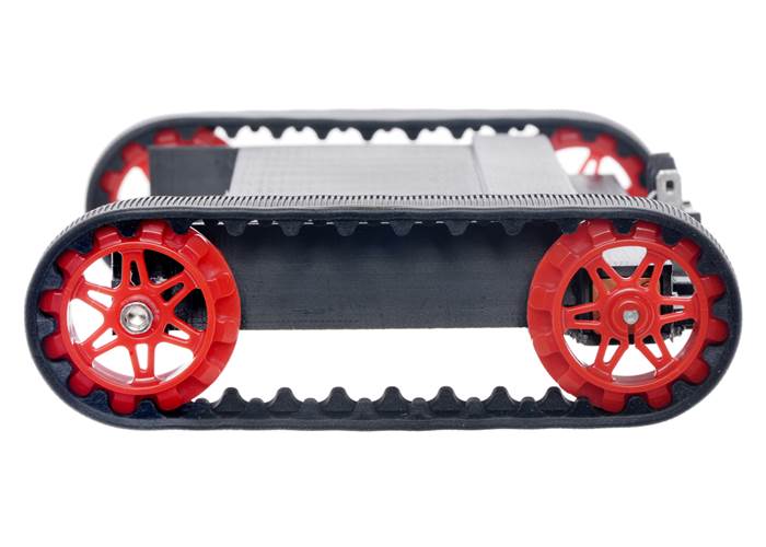 This track set includes a pair of 30-tooth silicone tracks, two red drive sprockets measuring 35 mm (1.4″) in diameter, and two matching idler sprockets along with mounting hardware. To work properly with the track, the drive and idler sprockets should be set up approximately 85 mm (3.35″) apart. The drive sprockets are designed to work with 3mm D-shafts, such as those on our micro metal gearmotors and mini plastic gearmotors. These are the same sprockets we use on the Zumo chassis and robots, just in a different color and with a longer track.