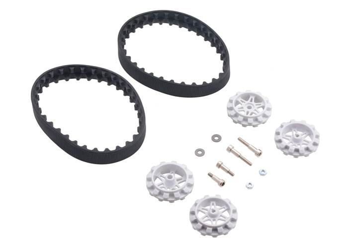 This track set includes a pair of 30-tooth silicone tracks, two white drive sprockets measuring 35 mm (1.4″) in diameter, and two matching idler sprockets along with mounting hardware.