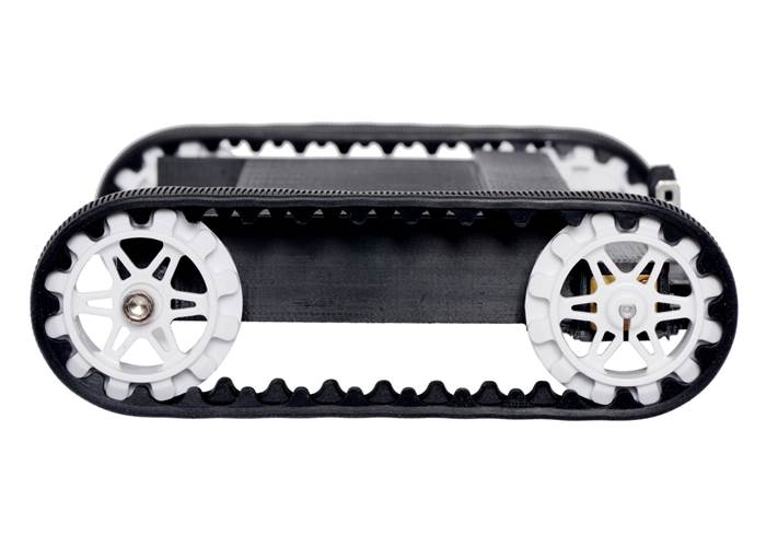 This track set includes a pair of 30-tooth silicone tracks, two white drive sprockets measuring 35 mm (1.4″) in diameter, and two matching idler sprockets along with mounting hardware. To work properly with the track, the drive and idler sprockets should be set up approximately 85 mm (3.35″) apart. The drive sprockets are designed to work with 3mm D-shafts, such as those on our micro metal gearmotors and mini plastic gearmotors. These are the same sprockets we use on the Zumo chassis and robots, just in a different color and with a longer track.