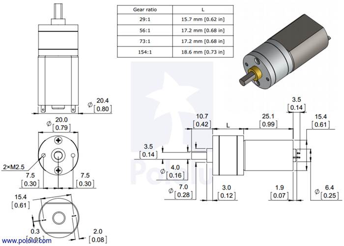 Dimensions of the original Pololu 20D mm metal gearmotors with shorter output shafts. Units are mm over [inches]. This diagram only applies to the listed gear ratios.