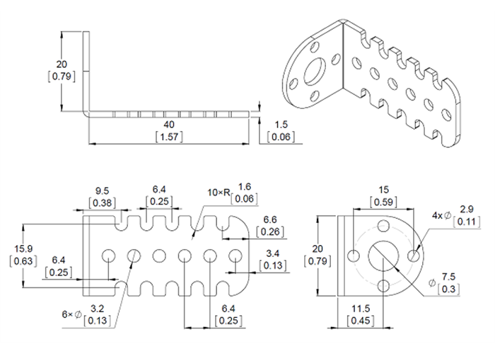 Mechanical drawing for the Pololu 20D mm metal gearmotor bracket. Units are mm over [inches]. |
