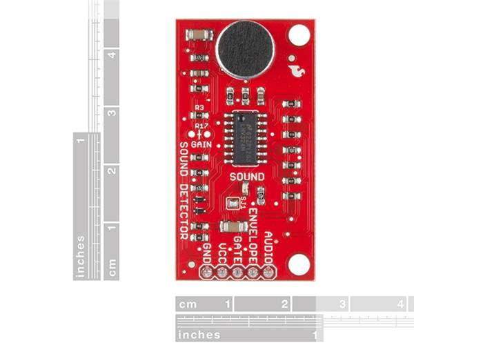 The envelope output allows you to easily read amplitude of sound by simply measuring the analogue voltage. Gain can be adjusted with a through-hole resistor to change the threshold of the binary (gate) output pin as well. Check the hookup guide below for more information about setting gain.