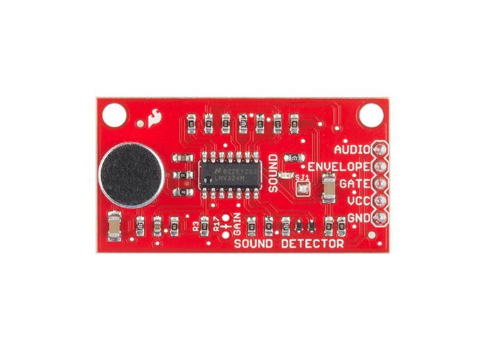 The SparkFun Sound Detector is a small and very easy-to-use audio sensing board with three different outputs. The Sound Detector not only provides an audio output, but also a binary indication of the presence of sound and an analogue representation of its amplitude. The three outputs are simultaneous and independent, so you can use as many or as few as you want at once.
