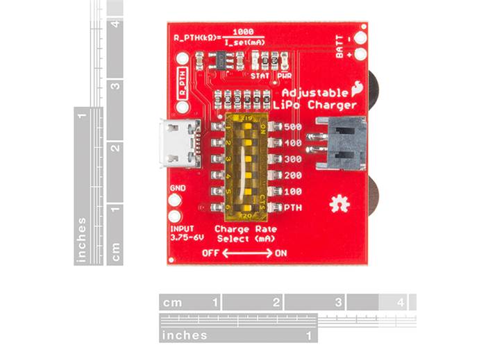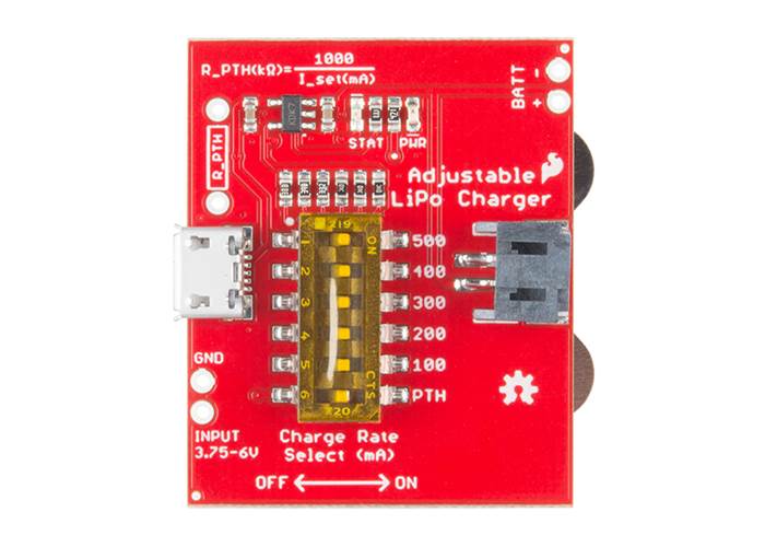 The SparkFun Adjustable LiPo Charger is a single-cell lithium polymer (LiPo) and lithium ion battery charger. Because it’s adjustable, this charger will be able to safely charge most of our single-cell batteries with ease. With its onboard charge rate selector, you will be able to set the maximum amount of current to charge your battery from 15mA to 500mA.