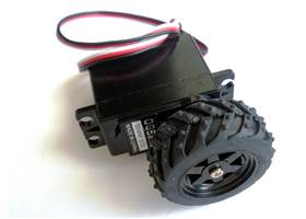 Looking for a quick & cheap robot drive? The S04NF continuous rotation servo and included wheel from Dagu is low cost way to get your robot moving.