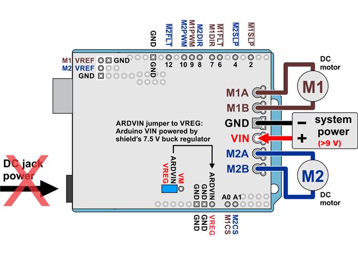 Dual G2 high-power motor driver shield powering an Arduino with the shield’s 7.5 V regulator (VREG).