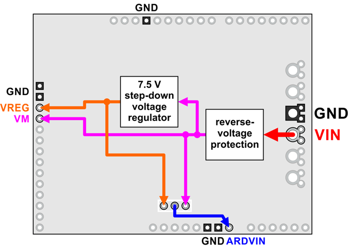 • When used as a shield, the motor power supply or 7.5 V regulator output can optionally be used to power the Arduino base for single-supply operation