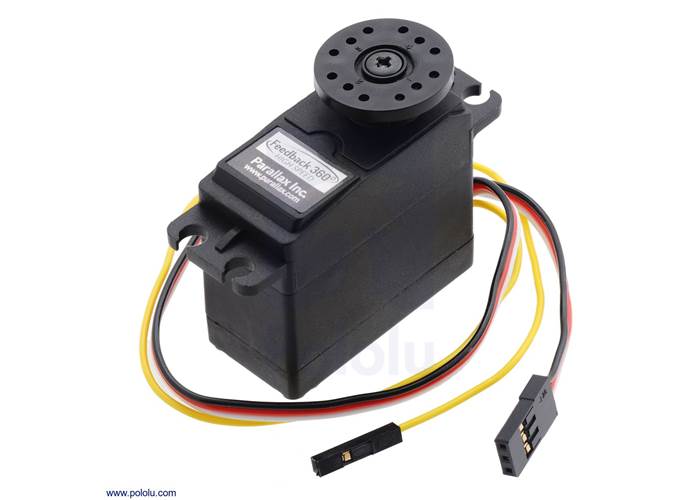 The Parallax Feedback 360° provides the functionality of a light-duty standard servo, a continuous rotation servo, a high-speed servo, and encoder feedback in one convenient package. Its speed is controlled with standard RC servo pulses, just like a typical continuous rotation servo, and it provides a return signal line from an internal Hall effect sensor that provides digital angular position feedback. An external microcontroller can use this signal to make the servo hold any angle, much like a standard servo except without any limits on the range of motion, or it can use it for closed-loop speed control. Recommended operating voltage range is 5.8 V to 8.4 V