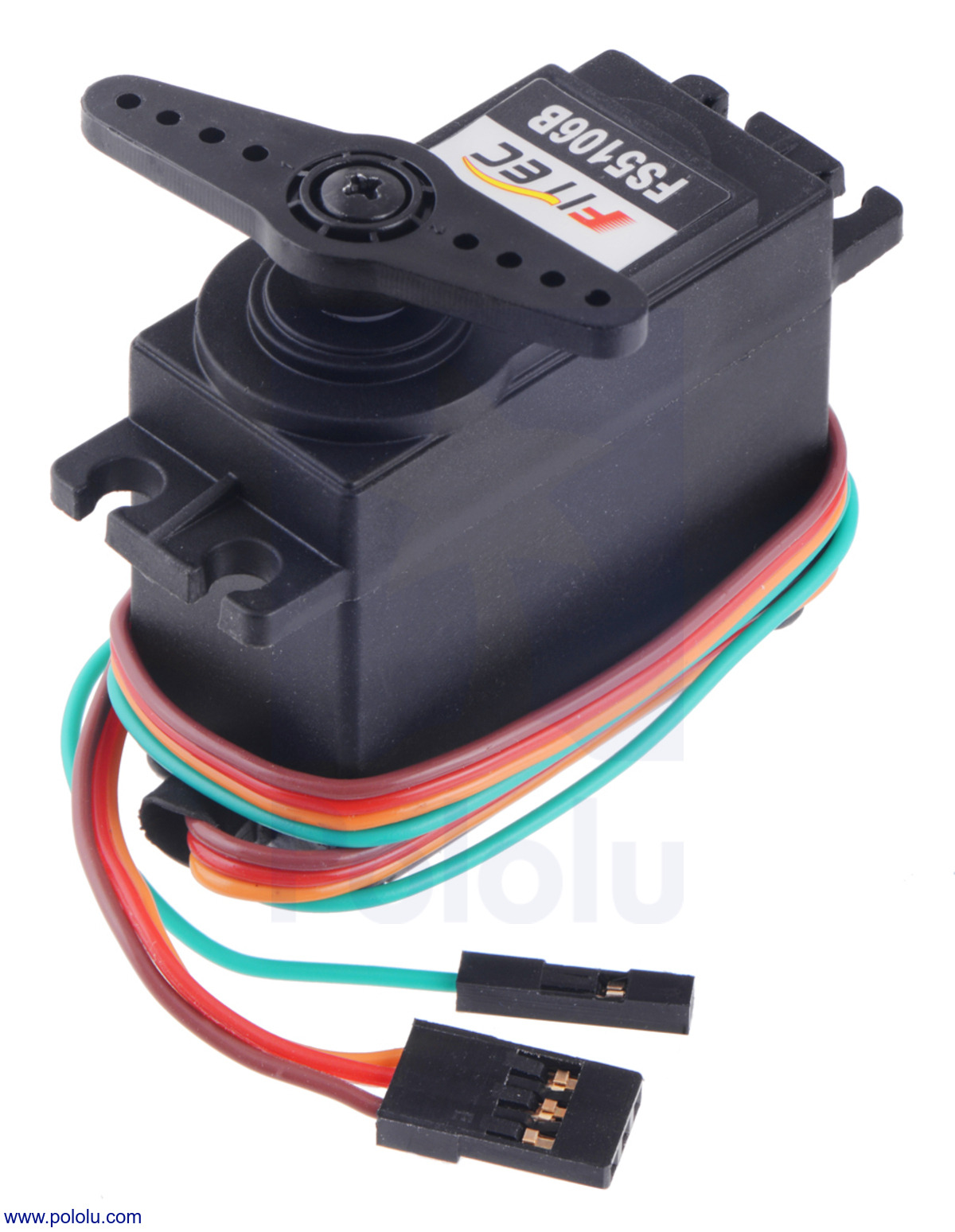 The FS5106B is a general-purpose standard-size analogue servo from FEETECH. The output shaft is supported by two ball bearings for reduced friction. The FS5106B works with standard RC servo pulses, providing a running angle of approximately 180° over a servo pulse range of around 700 µs to 2300 µs, and it has a 12″ (30 cm) cable that is terminated with a standard JR-style connector, which is Futaba-compatible. You can find more information about this servo in its datasheet (435k pdf).