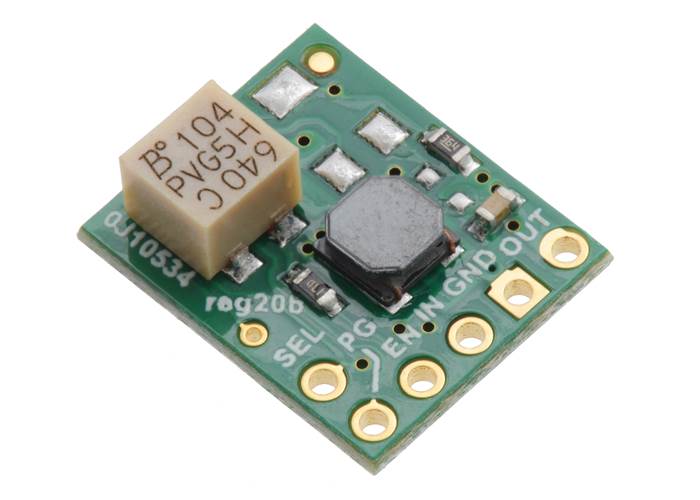 The step-up/step-down regulator has five main connections all located along the same edge of the board: the output voltage (OUT), ground (GND), the input voltage (IN), an enable input (EN), and a power good indicator (PG). A sixth pin, SEL, can optionally be used to change the output voltage from 5 V to 6 V.