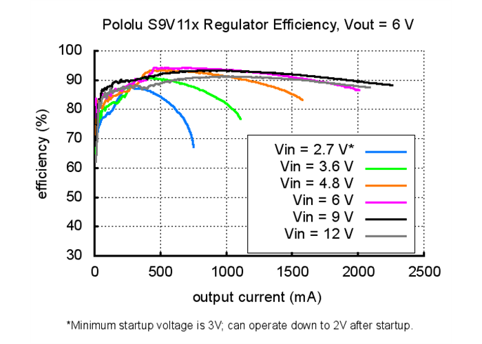 Note: the minimum startup voltage is 3V, but the regulator can operate down to 2V after startup.