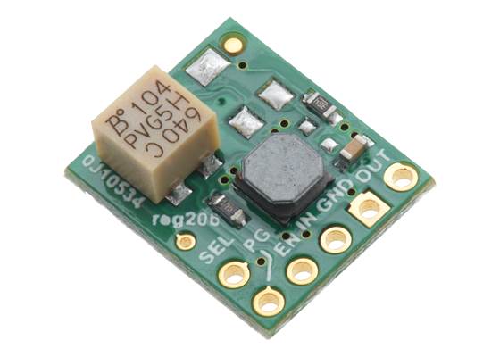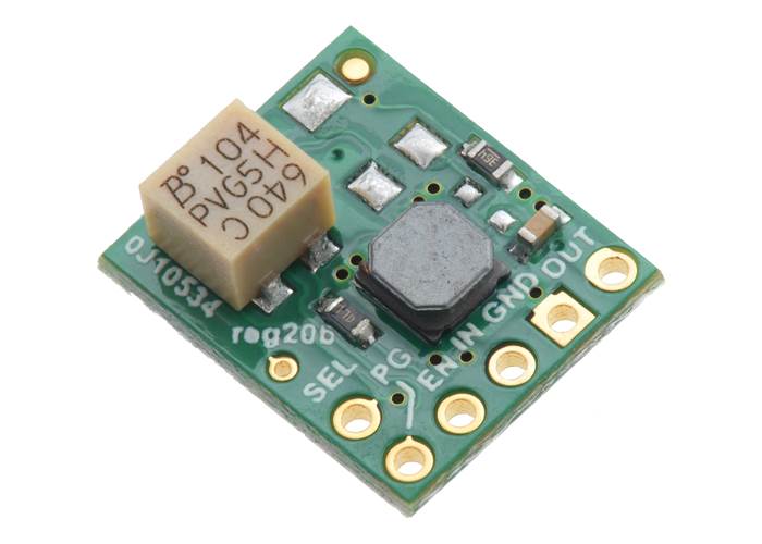 The step-up/step-down regulator has five main connections all located along the same edge of the board: the output voltage (OUT), ground (GND), the input voltage (IN), an enable input (EN), and a power good indicator (PG). A sixth pin, SEL, can optionally be used to change the output voltage from 3.3 V to 5 V.