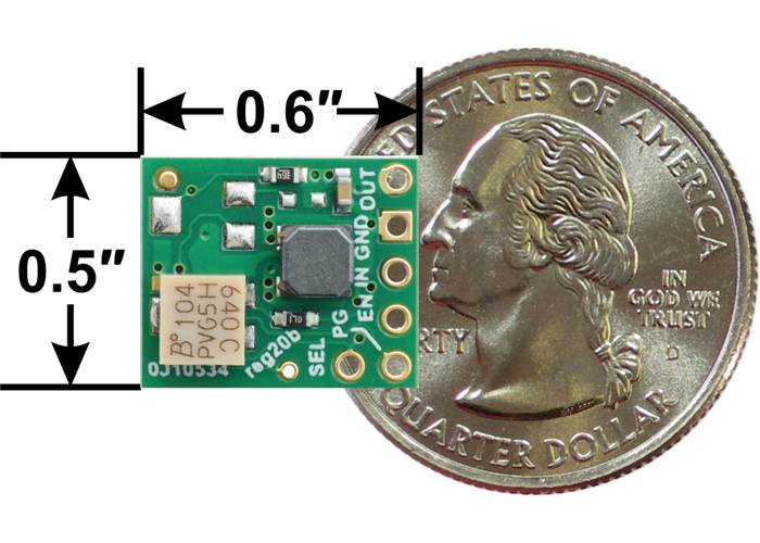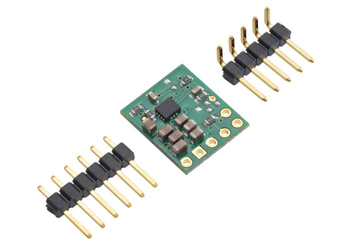The five main through-holes are arranged with a 0.1″ spacing along the edge of the board for compatibility with standard solderless breadboards and perfboards and connectors that use a 0.1″ grid. You can solder wires directly to the board or solder in pieces of the included breakaway 6×1 straight male header strip or the 5×1 right-angle male header strip as desired. The additional straight male header pin can be soldered into the SEL input, though this could prevent the regulator from being used in a breadboard.
