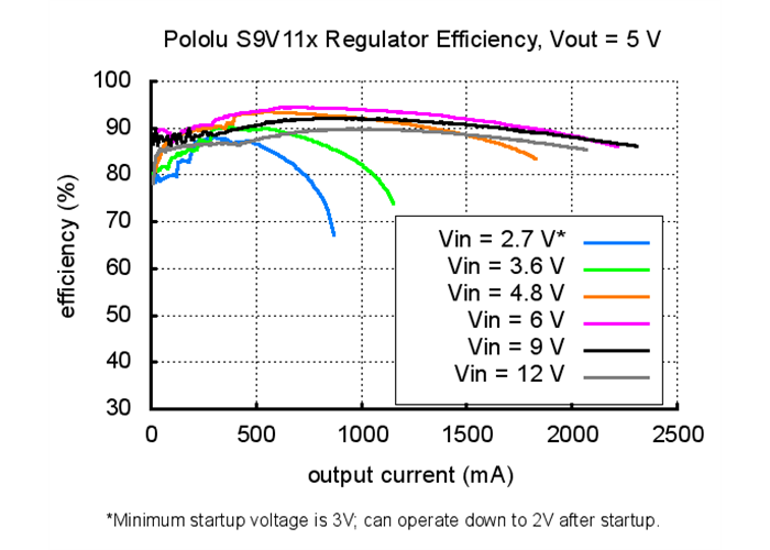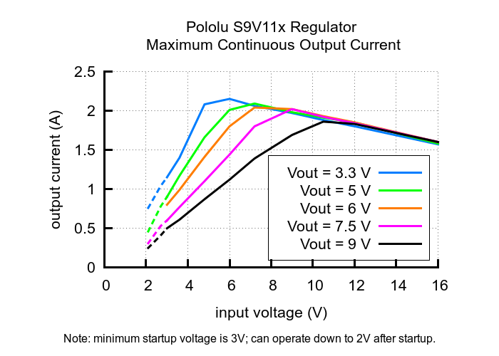 Note that the startup current for input voltages above the regulated output voltage is limited to approximately 700 mA, and currents in excess of this are only available after the output has finished stabilizing. For input voltages below the output voltage, the available start up current decreases linearly with the input voltage to approximately 0.3 A with an input of 3 V. Large capacitive loads will generally not pose a problem because they will gradually charge up even with the current limit active, so while they may increase the time it takes an S9V11x family regulator to start up, the regulator should still eventually stabilize. A purely resistive load, however, could prevent the regulator from ever reaching the desired output voltage. For example, if the output of the regulator is 5V and you put a 5 Ω resistor between VOUT and GND and then apply power to the regulator, the output voltage will never rise past 3.5 V, the voltage at which the current draw reaches the 700 mA limit. As such, this family of regulators is intended for applications like robotics, where any large loads are controllable and can be applied only after the regulator has finished starting up.