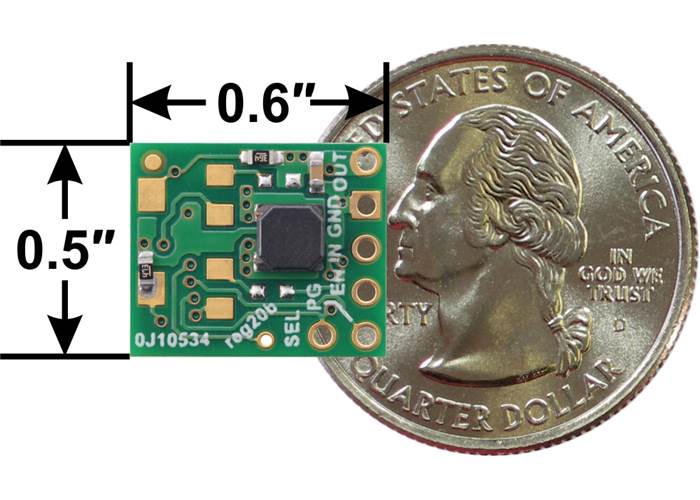 The five main through-holes are arranged with a 0.1″ spacing along the edge of the board for compatibility with standard solderless breadboards and perfboards and connectors that use a 0.1″ grid. You can solder wires directly to the board or solder in pieces of the included breakaway 6×1 straight male header strip or the 5×1 right-angle male header strip as desired. The additional straight male header pin can be soldered into the SEL input, though this could prevent the regulator from being used in a breadboard.