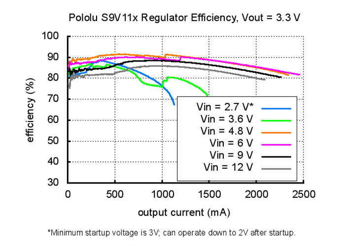 Note that the startup current for input voltages above the regulated output voltage is limited to approximately 700 mA, and currents in excess of this are only available after the output has finished stabilizing. For input voltages below the output voltage, the available start up current decreases linearly with the input voltage to approximately 0.3 A with an input of 3 V. Large capacitive loads will generally not pose a problem because they will gradually charge up even with the current limit active, so while they may increase the time it takes an S9V11x family regulator to start up, the regulator should still eventually stabilize. A purely resistive load, however, could prevent the regulator from ever reaching the desired output voltage. For example, if the output of the regulator is 5V and you put a 5 Ω resistor between VOUT and GND and then apply power to the regulator, the output voltage will never rise past 3.5 V, the voltage at which the current draw reaches the 700 mA limit. As such, this family of regulators is intended for applications like robotics, where any large loads are controllable and can be applied only after the regulator has finished starting up.