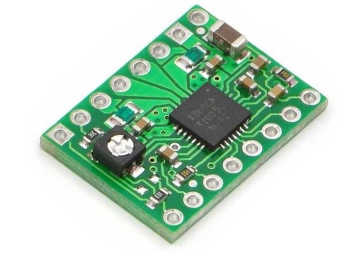This product is a carrier board or breakout board for Allegro’s A4988 DMOS Microstepping Driver with Translator and Overcurrent Protection; we therefore recommend careful reading of the A4988 datasheet (1MB pdf) before using this product. This stepper motor driver lets you control one bipolar stepper motor at up to 2 A output current per coil (see the Power Dissipation Considerations section below for more information). Here are some of the driver’s key features: