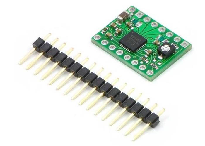 The A4988 stepper motor driver carrier comes with one 1×16-pin breakaway 0.1" male header. The headers can be soldered in for use with solderless breadboards or 0.1" female connectors. You can also solder your motor leads and other connections directly to the board. (A version of this board with headers already installed is also available.)