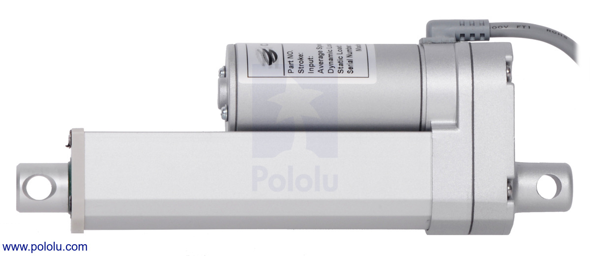 To test-drive the actuator, simply connect a power source of up to 12 V to the motor leads. Reversing the applied voltage will reverse the direction of motion. A motor controller or motor driver is required for electronic speed and direction control. We recommend our Jrk G2 24v13 Motor Controllers for use with the feedback actuators (see below for more information on this) and the Simple Motor Controller G2 18v15 for controlling the actuators without feedback, though many of our other motor controllers and motor drivers are capable of powering this actuator.
